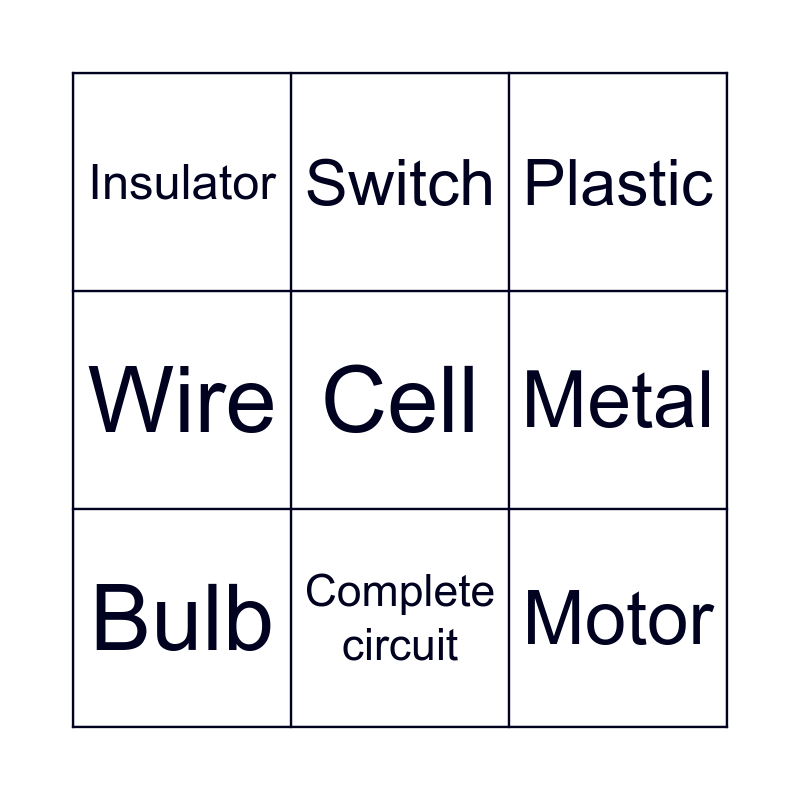 This bingo card has 14 words: Free!, Battery, Bulb, Switch, Wire, Cell, Motor, Buzzer, Complete circuit, Insulator, Conductor, Metal, Plastic and It stops working.