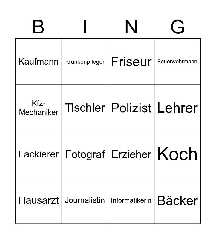 This bingo card has 19 words: Erzieher, Metzger, Friseur, Bäcker, Koch, Kfz-Mechaniker, Informatikerin, Kaufmann, Krankenpfleger, Lackierer, Fotograf, Tischler, Polizist, Journalistin, Hausarzt, Politiker, Feuerwehrmann, Lehrer and Kellnerin.