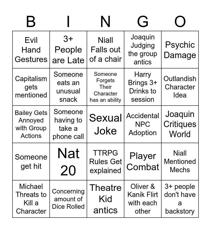 This bingo card has 45 words: Pigeon King, Sexual Joke, Oliver says F*ck me (Not Literally), Michael Threats to Kill a Character, Harry/Mateo faces consequences for their actions, Oliver & Kanik Flirt with each other, Niall Falls out of a chair, Mention of a Past Campaign (Not the characters), Psychic Damage, Concerning amount of Dice Rolled, Joaquin Judging the group antics, Accidental NPC Adoption, TTRPG Rules Get explained, Nat 20, Dice gets sent to Jail, Theatre Kid antics, Unique Voices, Bailey Gets Annoyed with Group Actions, Joaquin Throws a Dice, Outlandish Character Idea, 3+ People are Late, Joaquin Swears Due to a Dice roll, Nat 1, Evil Hand Gestures, Bongo Cat, Joaquin Critiques World, Someone Has New Dice, Michael Hates Mechs, Player Combat, Someone get hit, Outdated Reference, Niall Mentioned Mechs, Someone Forgets a Character name, D&D Beyond Acts up, Someone gets Ragebait, Someone having to take a phone call, HR Gets Involved, Michael Mentions His Title, 3+ people don't have a backstory, Someone Forgets Their Character has an ability, Capitalism gets mentioned, Harry Brings 3+ Drinks to session, Convoluted Plan gets made, Someone eats an unusual snack and 2+ HDYWTDT.