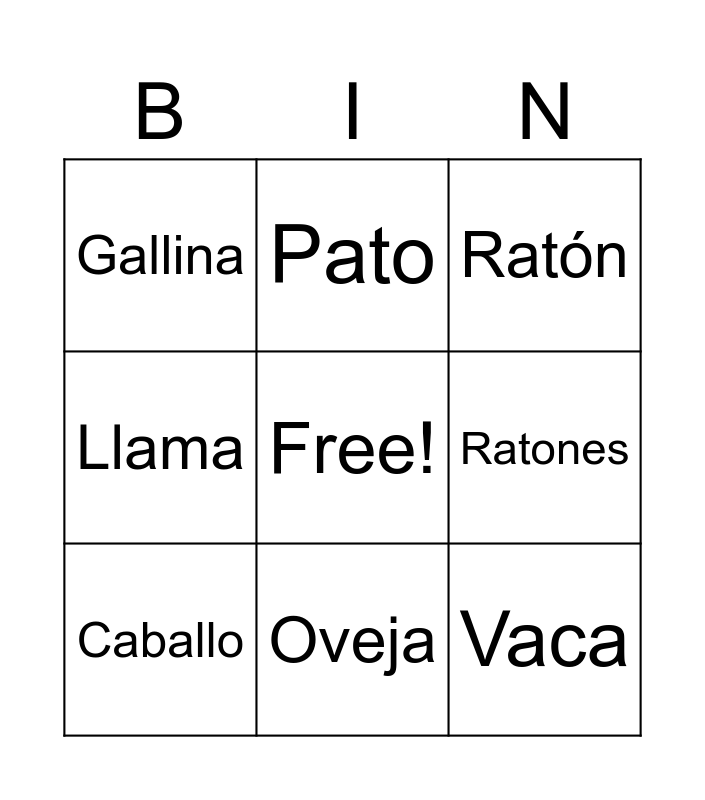 This bingo card has a free space and 11 words: Cabra, Oveja, Vaca, Caballo, Pato, Ratón, Ratones, Toro, Llama, Gallina and Burro.