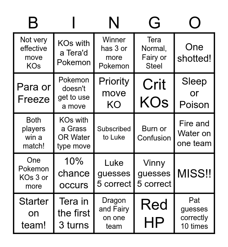 This bingo card has a free space and 24 words: 10% chance occurs, Tera in the first 3 turns, Priority move KO, Starter on team!, One shotted!, Not very effective move KOs, Para or Freeze, KOs with a Tera'd Pokemon, Burn or Confusion, Luke guesses 5 correct, Crit KOs, Both players win a match!, Vinny guesses 5 correct, MISS!!, Pokemon doesn't get to use a move, Red HP, Fire and Water on one team, Winner has 3 or more Pokemon, Sleep or Poison, KOs with a Grass OR Water type move, Pat guesses correctly 10 times, One Pokemon KOs 3 or more, Tera Normal, Fairy or Steel and Dragon and Fairy on one team.