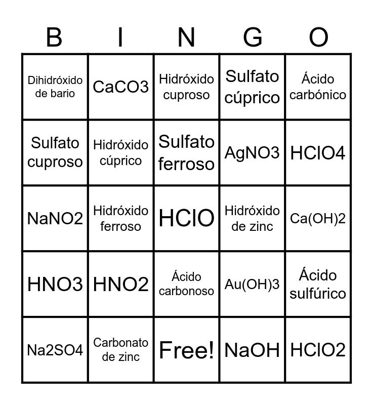 This bingo card has 31 words: Free!, Al(OH)3, Hidróxido ferroso, Hidróxido férrico, Dihidróxido de bario, Hidróxido cuproso, Hidróxido cúprico, Au(OH)3, Hidróxido de zinc, NaOH, Ca(OH)2, HClO, HClO2, HClO3, HClO4, Ácido sulfuroso, Ácido sulfúrico, HNO2, HNO3, Ácido carbonoso, Ácido carbónico, Hipoclorito de sodio, Na2SO4, CaCO3, AgNO3, Sulfato cuproso, Sulfato cúprico, NaNO2, Carbonato de zinc, Sulfato ferroso and Sulfato férrico.
