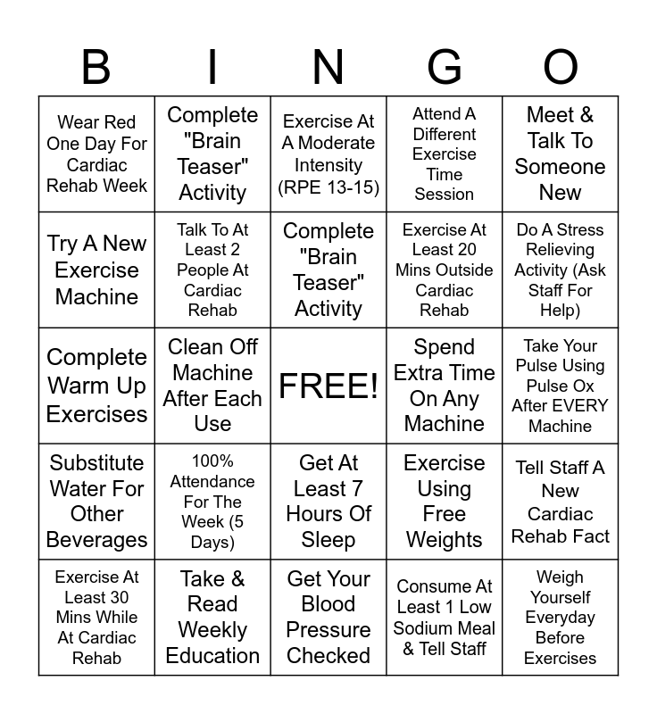 This bingo card has a free space and 24 words: 100% Attendance For The Week (5 Days), Take & Read Weekly Education, Complete "Brain Teaser" Activity, Exercise At Least 30 Mins While At Cardiac Rehab, Meet & Talk To Someone New, Wear Red One Day For Cardiac Rehab Week, Try A New Exercise Machine, Complete "Brain Teaser" Activity, Spend Extra Time On Any Machine, Get At Least 7 Hours Of Sleep, Exercise At Least 20 Mins Outside Cardiac Rehab, Complete Warm Up Exercises, Exercise Using Free Weights, Tell Staff A New Cardiac Rehab Fact, Talk To At Least 2 People At Cardiac Rehab, Consume At Least 1 Low Sodium Meal & Tell Staff, Take Your Pulse Using Pulse Ox After EVERY Machine, Exercise At A Moderate Intensity (RPE 13-15), Do A Stress Relieving Activity (Ask Staff For Help), Clean Off Machine After Each Use, Weigh Yourself Everyday Before Exercises, Substitute Water For Other Beverages, Attend A Different Exercise Time Session and Get Your Blood Pressure Checked.