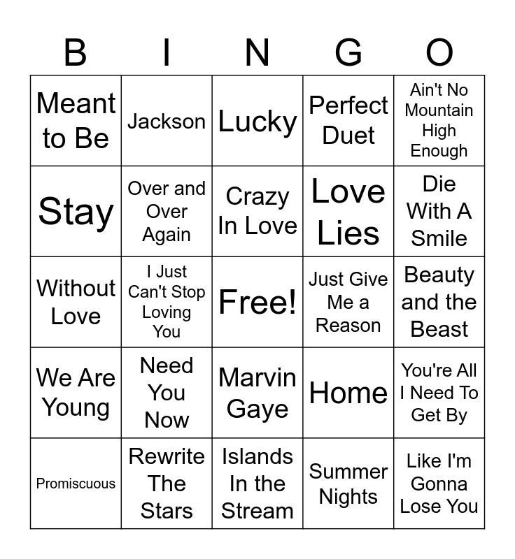 This bingo card has a free space and 44 words: You're The One That I Want, Like I'm Gonna Lose You, Shallow, Promiscuous, (I've Had) The Time Of My Life, Summer Nights, Lucky, Don't Go Breaking My Heart, Ain't No Mountain High Enough, Rewrite The Stars, Perfect Duet, Just Give Me a Reason, Marvin Gaye, Need You Now, I Got You Babe, Islands In the Stream, Say Something, Without Love, Eastside, Die With A Smile, Jackson, Don't You Wanna Stay, Are You Gonna Kiss Me Or Not, Meant to Be, Remind Me, Beauty and the Beast, Endless Love, Broken, Home, We Are Young, Dream A Little Dream Of Me, You're All I Need To Get By, If I Ever Fall in Love Again, Up Where We Belong, I Just Can't Stop Loving You, It Takes Two, I See the Light, When You're Gone, Crazy In Love, Stay, Love Lies, No Air, Over and Over Again and Closer.