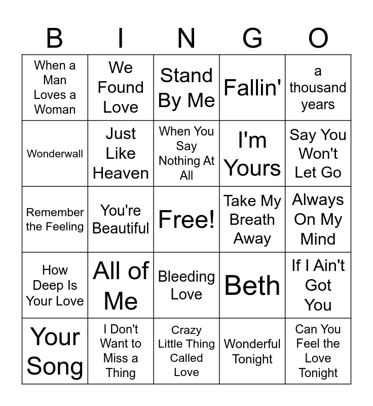 This bingo card has a free space and 60 words: Make You Feel My Love, I Don't Want to Miss a Thing, I Will Always Love You, How Deep Is Your Love, Wonderful Tonight, Thinking Out Loud, Just Like Heaven, I'll Stand By You, I'm Yours, Iris, Fallin', Is This Love, Wonderwall, Still Loving You, Stay With Me, When a Man Loves a Woman, Can You Feel the Love Tonight, a thousand years, You're Still The One, When You Say Nothing At All, Take My Breath Away, Stand By Me, Your Song, If I Ain't Got You, Just the Way You Are, Tennessee Whiskey, Can't Help Falling in Love, L-O-V-E, Say You Won't Let Go, We Belong Together, Faithfully, Shape of You, Sugar, Girls Like You, We Found Love, Just A Dream, Like I'm Gonna Lose You, You're Beautiful, Hopelessly Devoted To You, Remember the Feeling, I'll Be, All of Me, Always On My Mind, He Stopped Loving Her Today, Beth, Paint Me A Birmingham, You Say, Silly Love Songs, Best of My Love, Bleeding Love, Crazy Little Thing Called Love, The Power Of Love, Beautiful Crazy, Die A Happy Man, Forever and Ever, Amen, This Will Be (Everlasting Love), Classic, She Looks So Perfect, Accidentally In Love and Treasure.