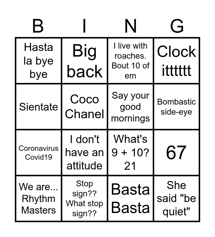 This bingo card has 16 words: Stop sign?? What stop sign??, 67, I live with roaches. Bout 10 of em, Hasta la bye bye, Coronavirus Covid19, Big back, What's 9 + 10? 21, Basta Basta, Sientate, Coco Chanel, We are... Rhythm Masters, Clock itttttt, I don't have an attitude, Bombastic side-eye, Say your good mornings and She said "be quiet".