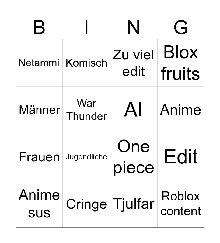 This bingo card has 16 words: Cringe, Edit, Zu viel edit, Netammi, Frauen, Komisch, One piece, Tjulfar, Männer, War Thunder, Anime sus, Blox fruits, Jugendliche, Anime, AI and Roblox content.
