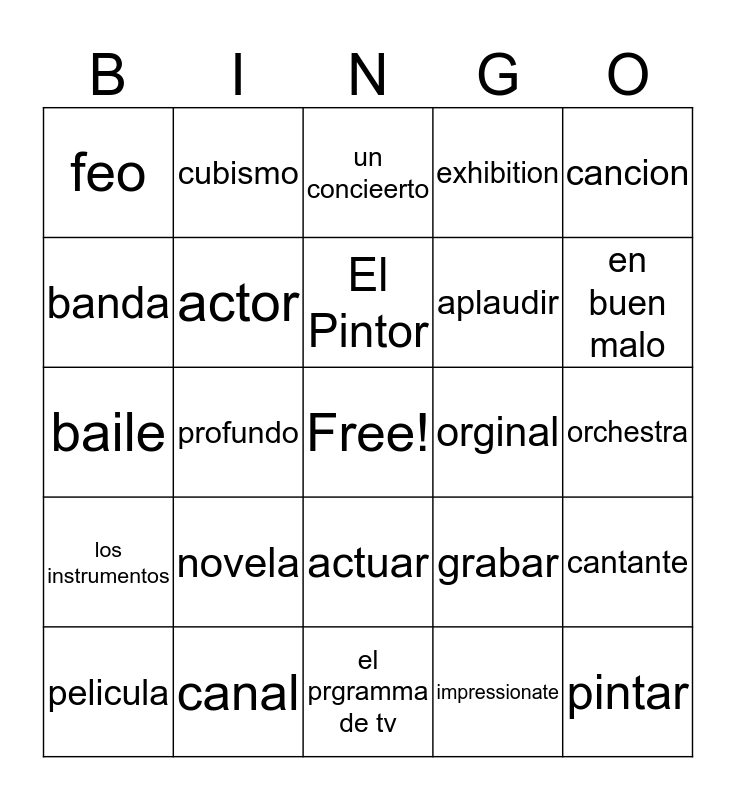 This bingo card has a free space and 24 words: novela, canal, El Pintor, pelicula, cancion, feo, banda, cubismo, orginal, actuar, aplaudir, baile, grabar, cantante, actor, impressionate, orchestra, un concieerto, en buen malo, profundo, pintar, los instrumentos, exhibition and el prgramma de tv.