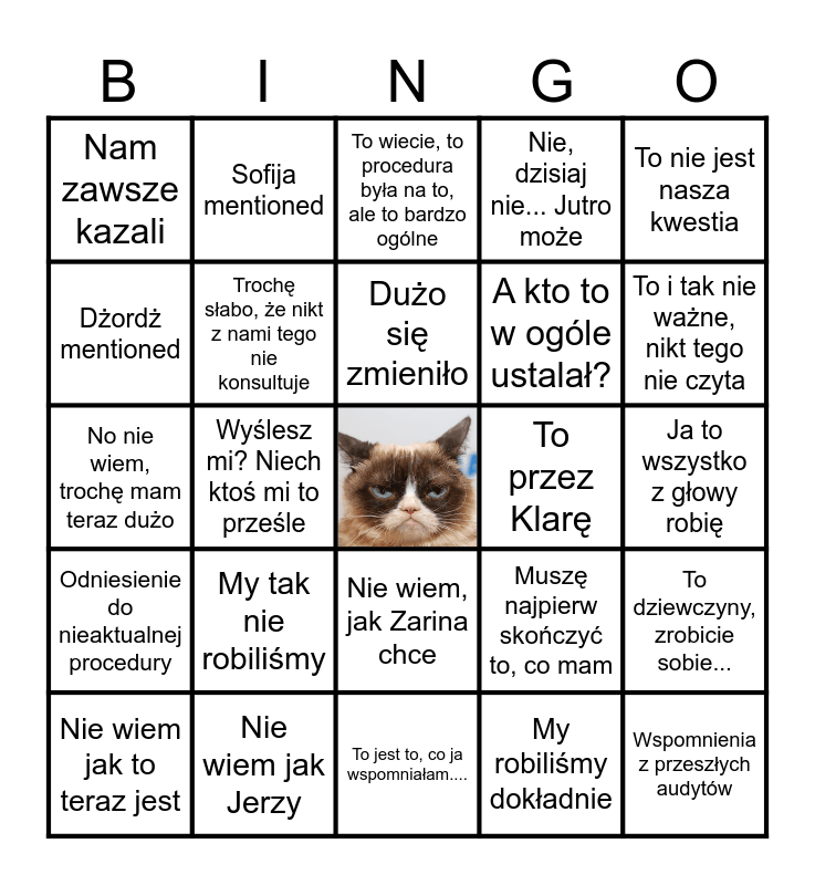 This bingo card has a free space and 24 words: My tak nie robiliśmy, Nie wiem jak Jerzy, Dużo się zmieniło, Nie wiem jak to teraz jest, To nie jest nasza kwestia, Nam zawsze kazali, Dżordż mentioned, Sofija mentioned, To przez Klarę, Nie wiem, jak Zarina chce, A kto to w ogóle ustalał?, No nie wiem, trochę mam teraz dużo, Muszę najpierw skończyć to, co mam, To dziewczyny, zrobicie sobie..., Trochę słabo, że nikt z nami tego nie konsultuje, My robiliśmy dokładnie, Ja to wszystko z głowy robię, To wiecie, to procedura była na to, ale to bardzo ogólne, To i tak nie ważne, nikt tego nie czyta, Wyślesz mi? Niech ktoś mi to prześle, Wspomnienia z przeszłych audytów, Odniesienie do nieaktualnej procedury, Nie, dzisiaj nie... Jutro może and To jest to, co ja wspomniałam.....