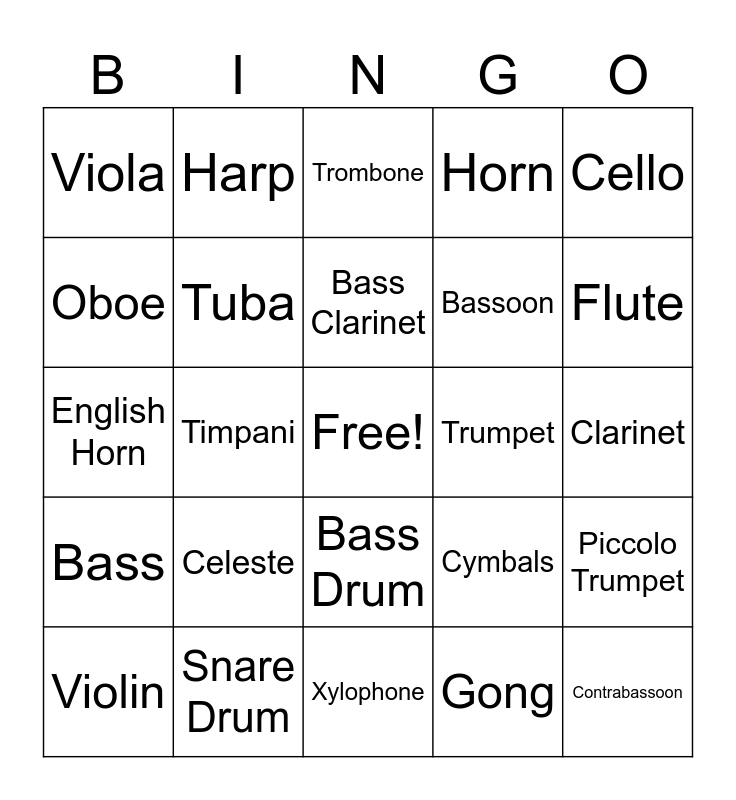 This bingo card has a free space and 24 words: Celeste, Snare Drum, Bass Clarinet, Violin, Cello, Viola, Oboe, Harp, Trumpet, Bass Drum, Bassoon, English Horn, Cymbals, Piccolo Trumpet, Tuba, Gong, Clarinet, Trombone, Flute, Timpani, Contrabassoon, Bass, Horn and Xylophone.