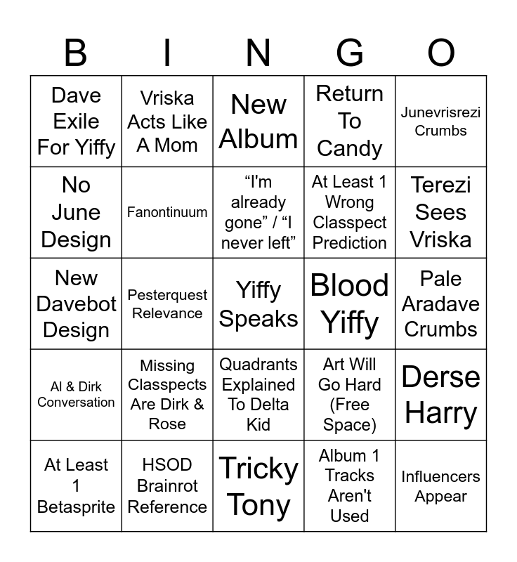 This bingo card has 25 words: Missing Classpects Are Dirk & Rose, Tricky Tony, “I'm already gone” / “I never left”, At Least 1 Betasprite, Junevrisrezi Crumbs, Dave Exile For Yiffy, No June Design, Vriska Acts Like A Mom, Blood Yiffy, Quadrants Explained To Delta Kid, At Least 1 Wrong Classpect Prediction, New Davebot Design, Art Will Go Hard (Free Space), Derse Harry, Fanontinuum, Influencers Appear, Pale Aradave Crumbs, New Album, Terezi Sees Vriska, Pesterquest Relevance, Yiffy Speaks, HSOD Brainrot Reference, Al & Dirk Conversation, Return To Candy and Album 1 Tracks Aren't Used.