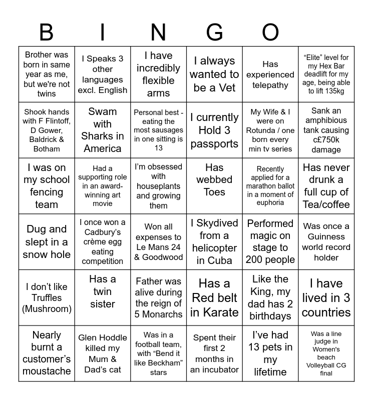 This bingo card has 36 words: Has a Red belt in Karate, Father was alive during the reign of 5 Monarchs, Spent their first 2 months in an incubator, Shook hands with F Flintoff, D Gower, Baldrick & Botham, Dug and slept in a snow hole, Has webbed Toes, Swam with Sharks in America, Was in a football team, with “Bend it like Beckham” stars, Has experienced telepathy, Like the King, my dad has 2 birthdays, Sank an amphibious tank causing c£750k damage, I always wanted to be a Vet, I have lived in 3 countries, Had a supporting role in an award-winning art movie, I currently Hold 3 passports, Brother was born in same year as me, but we're not twins, I don’t like Truffles (Mushroom), Recently applied for a marathon ballot in a moment of euphoria, I was on my school fencing team, I have incredibly flexible arms, I’m obsessed with houseplants and growing them, I once won a Cadbury’s crème egg eating competition, I Skydived from a helicopter in Cuba, Won all expenses to Le Mans 24 & Goodwood, Performed magic on stage to 200 people, I Speaks 3 other languages excl. English, My Wife & I were on Rotunda / one born every min tv series, Glen Hoddle killed my Mum & Dad’s cat, Personal best - eating the most sausages in one sitting is 13, “Elite” level for my Hex Bar deadlift for my age, being able to lift 135kg, Was a line judge in Women's beach Volleyball CG final, Nearly burnt a customer’s moustache, Was once a Guinness world record holder, Has never drunk a full cup of Tea/coffee, Has a twin sister and I’ve had 13 pets in my lifetime.