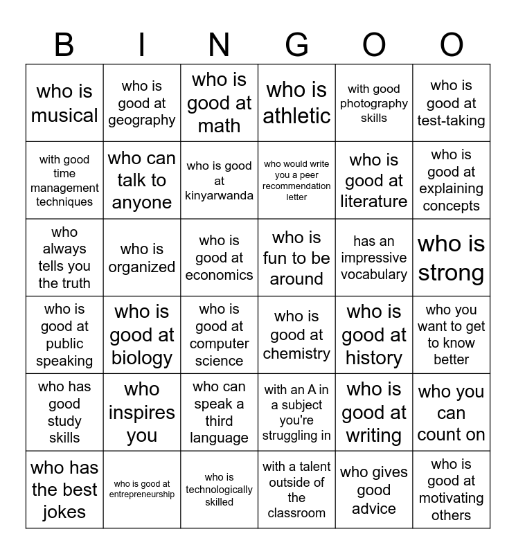 This bingo card has 36 words: with an A in a subject you're struggling in, who can speak a third language, with a talent outside of the classroom, with good time management techniques, who is good at public speaking, who is fun to be around, who can talk to anyone, who is technologically skilled, with good photography skills, who is good at writing, who is good at explaining concepts, who is athletic, who you can count on, who is organized, who would write you a peer recommendation letter, who is musical, who has good study skills, has an impressive vocabulary, who always tells you the truth, who is good at math, who is good at economics, who is good at biology, who is good at chemistry, who is good at computer science, who is good at history, who is good at geography, who is good at literature, who is good at entrepreneurship, who is good at kinyarwanda, who is good at test-taking, who is good at motivating others, who has the best jokes, who you want to get to know better, who is strong, who inspires you and who gives good advice.