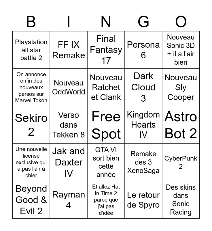 This bingo card has a free space and 24 words: Jak and Daxter IV, Rayman 4, Nouveau Ratchet et Clank, Beyond Good & Evil 2, Nouveau Sonic 3D + il a l'air bien, Playstation all star battle 2, On annonce enfin des nouveaux persos sur Marvel Tokon, FF IX Remake, Kingdom Hearts IV, GTA VI sort bien cette année, Dark Cloud 3, Sekiro 2, Remake des 3 XenoSaga, CyberPunk 2, Nouveau OddWorld, Le retour de Spyro, Astro Bot 2, Final Fantasy 17, Nouveau Sly Cooper, Verso dans Tekken 8, Des skins dans Sonic Racing, Une nouvelle license exclusive qui a pas l'air à chier, Persona 6 and Et allez Hat in Time 2 parce que j'ai pas d'idée.