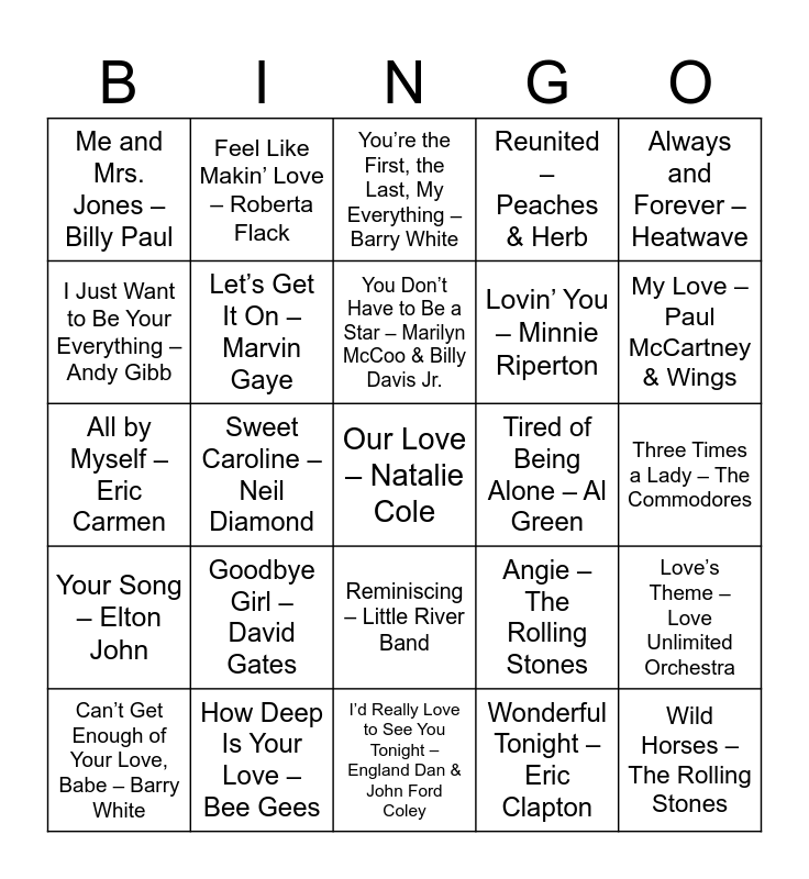 This bingo card has 58 words: The First Time Ever I Saw Your Face – Roberta Flack, How Deep Is Your Love – Bee Gees, Let’s Stay Together – Al Green, Your Song – Elton John, Wonderful Tonight – Eric Clapton, Just the Way You Are – Billy Joel, Let’s Get It On – Marvin Gaye, Best of My Love – The Emotions, Lovin’ You – Minnie Riperton, You Make Me Feel Brand New – The Stylistics, Reunited – Peaches & Herb, Just My Imagination – The Temptations, You Are Everything – Diana Ross & Marvin Gaye, That’s the Way of the World – Earth, Wind & Fire, Could It Be I’m Falling in Love – The Spinners, Me and Mrs. Jones – Billy Paul, Our Love – Natalie Cole, Always and Forever – Heatwave, The Love I Lost – Harold Melvin & the Blue Notes, You Don’t Have to Be a Star – Marilyn McCoo & Billy Davis Jr., Tired of Being Alone – Al Green, You’re the First, the Last, My Everything – Barry White, Can’t Get Enough of Your Love, Babe – Barry White, Love’s Theme – Love Unlimited Orchestra, Still – The Commodores, Three Times a Lady – The Commodores, Killing Me Softly with His Song – Roberta Flack, Bridge Over Troubled Water – Simon & Garfunkel, My Love – Paul McCartney & Wings, Maybe I’m Amazed – Paul McCartney, Annie’s Song – John Denver, Time in a Bottle – Jim Croce, I’ll Have to Say I Love You in a Song – Jim Croce, You’ve Got a Friend – James Taylor / Carole King, It’s Too Late – Carole King, Moondance – Van Morrison, Landslide – Fleetwood Mac, Sweet Caroline – Neil Diamond, All by Myself – Eric Carmen, I Go Crazy – Paul Davis, Goodbye Girl – David Gates, Wild Horses – The Rolling Stones, Angie – The Rolling Stones, Make It with You – Bread, Love Will Keep Us Together – Captain & Tennille, Baby, I Love Your Way – Peter Frampton, Color My World – Chicago, Reminiscing – Little River Band, I’d Really Love to See You Tonight – England Dan & John Ford Coley, You Needed Me – Anne Murray, Summer Breeze – Seals and Crofts, Silly Love Songs – Wings, How Much I Feel – Ambrosia, Don't Go Breaking My Heart – Elton John & Kiki Dee, Feel Like Makin’ Love – Roberta Flack, Lost in Love – Air Supply, I Just Want to Be Your Everything – Andy Gibb and Best of My Love – The Eagles.