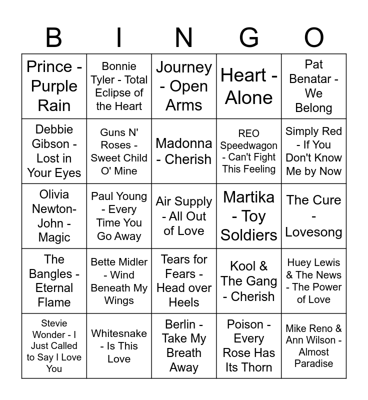 This bingo card has 49 words: A-ha - Take on Me, Air Supply - All Out of Love, Barbra Streisand - Woman in Love, Berlin - Take My Breath Away, Bette Midler - Wind Beneath My Wings, Bon Jovi - I'll Be There for You, Bonnie Tyler - Total Eclipse of the Heart, Cyndi Lauper - Time After Time, Debbie Gibson - Lost in Your Eyes, Foreigner - I Want to Know What Love Is, Guns N' Roses - Sweet Child O' Mine, Heart - Alone, Huey Lewis & The News - The Power of Love, Kool & The Gang - Cherish, Linda Ronstadt & Aaron Neville - Don't Know Much, Lionel Richie - Hello, Madonna - Cherish, Martika - Toy Soldiers, Marvin Gaye - Sexual Healing, Pat Benatar - We Belong, Paul Young - Every Time You Go Away, Poison - Every Rose Has Its Thorn, Prince - Purple Rain, REO Speedwagon - Can't Fight This Feeling, Rick Astley - Never Gonna Give You Up, Simply Red - If You Don't Know Me by Now, Stevie Wonder - I Just Called to Say I Love You, Taylor Dayne - I'll Always Love You, Tears for Fears - Head over Heels, The Bangles - Eternal Flame, B52s - love shack, The Police - Every Breath You Take, Thompson Twins - Hold Me Now, U2 - With or Without You, Whitesnake - Is This Love, Whitney Houston - Greatest Love of All, Will to Power - Baby, I Love Your Way, Whitney Houston - Saving All My Love for You, The Cure - Lovesong, Peter Gabriel - In Your Eyes, Madonna - Crazy for You, Mike + The Mechanics - The Living Years, Mike Reno & Ann Wilson - Almost Paradise, Mr. Mister - Broken Wings, Olivia Newton-John - Magic, Journey - Open Arms, Kenny Rogers - Lady, Chris de Burgh - The Lady in Red and Billy Ocean - Suddenly.