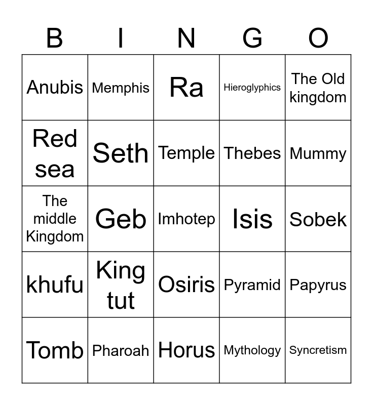 This bingo card has 30 words: Pharoah, Dynasty, Geb, Tefnut, Anubis, Ra, Seth, Osiris, Isis, Horus, Sobek, Imhotep, Mythology, Syncretism, Mummy, Delta, Pyramid, khufu, King tut, The Old kingdom, The middle Kingdom, The new kingdom, Memphis, Thebes, Red sea, Hieroglyphics, Papyrus, Tomb, Temple and Mummification.