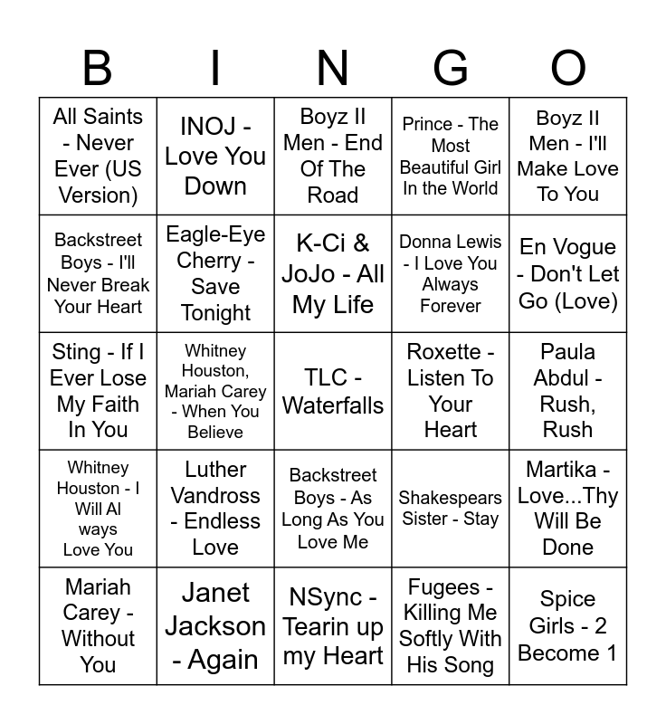 This bingo card has 50 words: Lauryn Hill - Nothing Even Matters feat. D'Angelo, TLC - Waterfalls, Mariah Carey - Vision Of Love, NSync - Tearin up my Heart, Luther Vandross - Endless Love, Jessica Simpson - I Wanna Love You Forever, INOJ - Love You Down, All-4-One - I Swear, Backstreet Boys - I'll Never Break Your Heart, Savage Garden - Truly Madly Deeply, Eagle-Eye Cherry - Save Tonight, Prince - The Most Beautiful Girl In the World, Martika - Love...Thy Will Be Done, Shakespears Sister - Stay, Extreme - More Than Words, Whitney Houston - All The Man That I Need, K-Ci & JoJo - All My Life, Roxette - Listen To Your Heart, Take That - How Deep Is Your Love, Boyz II Men - I'll Make Love To You, Whitney Houston, Mariah Carey - When You Believe, Fugees - Killing Me Softly With His Song, All Saints - Never Ever (US Version), Donna Lewis - I Love You Always Forever, Seal - Kiss From A Rose, Spice Girls - 2 Become 1, En Vogue - Don't Let Go (Love), Shai - If I Ever Fall In Love, Boyz II Men - End Of The Road, Backstreet Boys - As Long As You Love Me, Meat Loaf - I'd Do Anything For Love (But I Won't Do That), George Michael, Elton John - Don't Let The Sun Go Down On Me (Live), Simply Red - Stars, Annie Lennox - No More "I Love You's", Janet Jackson - Again, Brandy - Have You Ever, Toni Braxton - Un-Break My Heart, Michael Bolton - When a Man Loves a Woman, D'Angelo - Lady, Paula Abdul - Rush, Rush, Babyface - How Come, How Long, Toni Braxton - Breathe Again, Madonna - Rain, Savage Garden - I Knew I Loved You, Mariah Carey - Without You, Sting - If I Ever Lose My Faith In You, Nick Cave & The Bad Seeds ft. Kylie Minogue - Where The Wild Roses Grow, Sinéad O'Connor - Nothing Compares 2 U, Whitney Houston - I Will Always Love You and Mariah Carey - Hero.