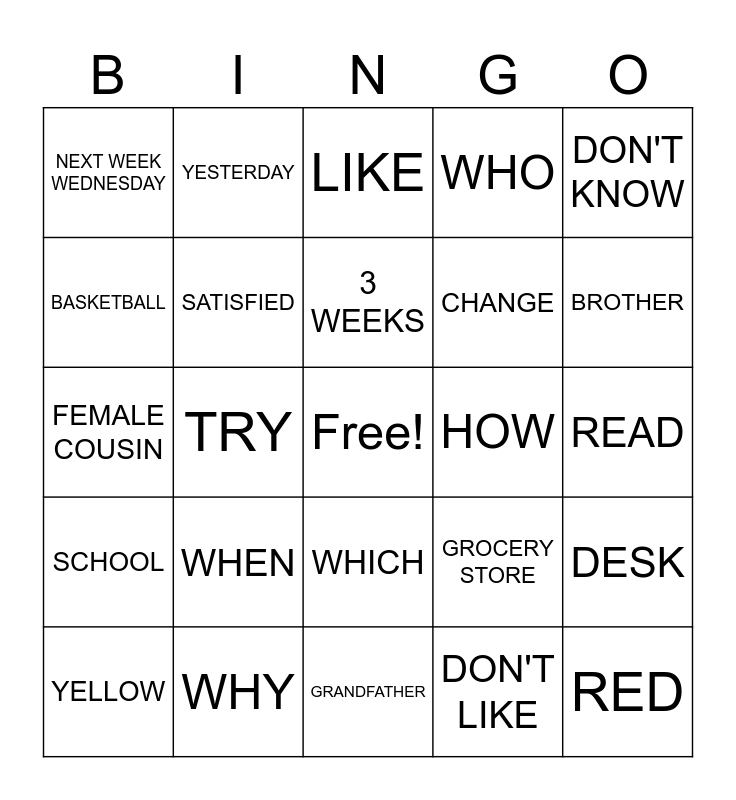 This bingo card has a free space and 44 words: PINK, RED, GREEN, YELLOW, PURPLE, DON'T LIKE, LIKE, KNOW, DON'T KNOW, WHY, WHO, HOW, WHICH, WHEN, GRANDMOTHER, GRANDFATHER, AUNT, FEMALE COUSIN, SISTER, BROTHER, YESTERDAY, 2 DAYS AGO, LAST WEEK FRIDAY, NEXT WEEK WEDNESDAY, SOCCER, READ, LIBRARY, GAS STATION, GROCERY STORE, SCHOOL, PAPER, DESK, TALK, CHAT, TRY, GET TOGETHER, DANCE, 2 MONTHS, 3 WEEKS, BASKETBALL, CHANGE, BUY, SATISFIED and EAGER.