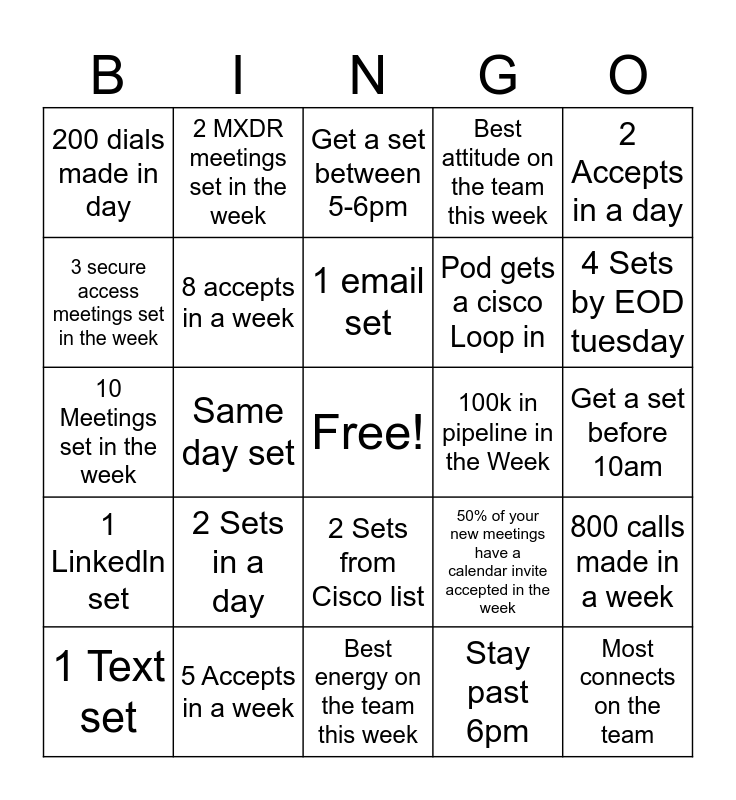 This bingo card has a free space and 24 words: 2 Sets in a day, 5 Accepts in a week, 1 email set, 1 Text set, 2 Accepts in a day, 200 dials made in day, 3 secure access meetings set in the week, 2 MXDR meetings set in the week, 100k in pipeline in the Week, 2 Sets from Cisco list, Pod gets a cisco Loop in, 10 Meetings set in the week, 50% of your new meetings have a calendar invite accepted in the week, 800 calls made in a week, 8 accepts in a week, Stay past 6pm, Get a set before 10am, Get a set between 5-6pm, 4 Sets by EOD tuesday, Same day set, Most connects on the team, 1 Linkedln set, Best attitude on the team this week and Best energy on the team this week.