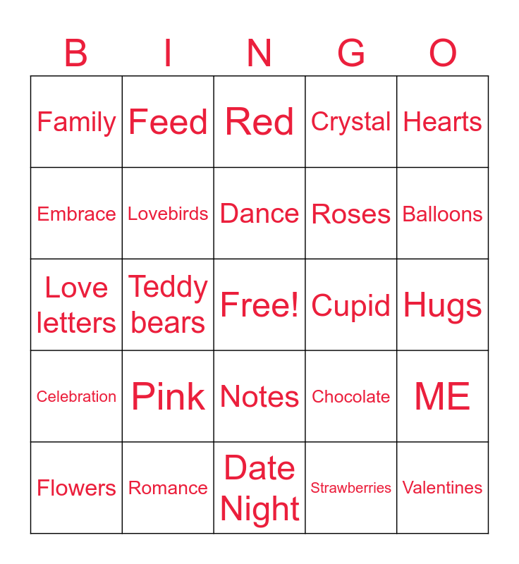 This bingo card has a free space and 29 words: Flowers, Candy, Teddy bears, Fudge, Family, Red, Lovebirds, Pink, Cupid, Romance, Hugs, Valentines, Date Night, Strawberries, Balloons, Bouquet, Notes, Celebration, Hearts, Love letters, Chocolate, Cupcakes, Roses, Embrace, Crystal, Feed, ME, Dance and Gift.