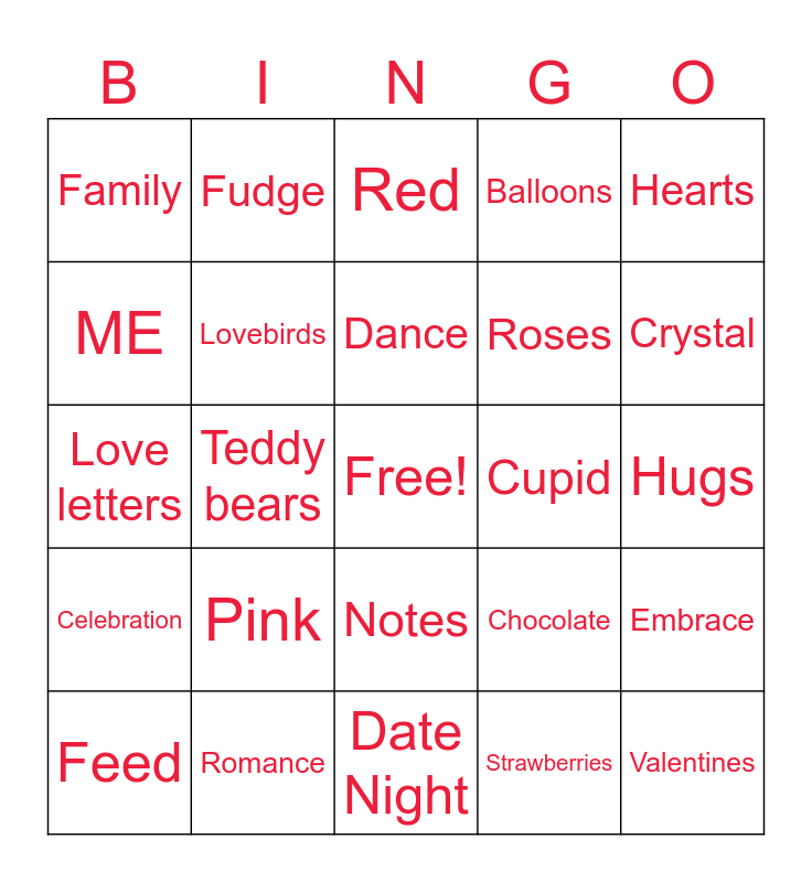 This bingo card has a free space and 29 words: Feed, Candy, Teddy bears, Fudge, Family, Red, Lovebirds, Pink, Cupid, Romance, Hugs, Valentines, Date Night, Strawberries, Crystal, Bouquet, Notes, Celebration, Hearts, Love letters, Chocolate, Cupcakes, Roses, ME, Balloons, Fudge, Embrace, Dance and Gift.