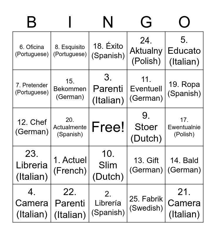 This bingo card has a free space and 25 words: 1. Actuel (French), 2. Librería (Spanish), 3. Parenti (Italian), 4. Camera (Italian), 5. Educato (Italian), 6. Oficina (Portuguese), 7. Pretender (Portuguese), 8. Esquisito (Portuguese), 9. Stoer (Dutch), 10. Slim (Dutch), 11. Eventuell (German), 12. Chef (German), 13. Gift (German), 14. Bald (German), 15. Bekommen (German), 16. Sympatyczny (Polish), 17. Ewentualnie (Polish), 18. Éxito (Spanish), 19. Ropa (Spanish), 20. Actualmente (Spanish), 21. Camera (Italian), 22. Parenti (Italian), 23. Libreria (Italian), 24. Aktualny (Polish) and 25. Fabrik (Swedish).