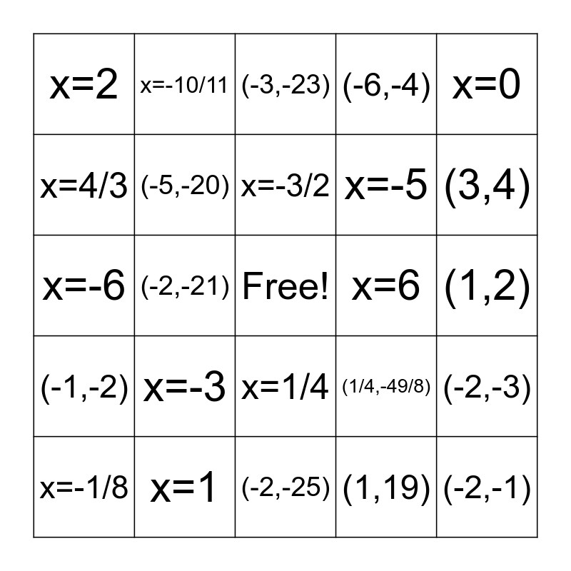 This bingo card has a free space and 24 words: x=-3, x=1, x=-3/2, x=-1/8, x=0, x=2, x=4/3, x=-10/11, x=6, x=1/4, x=-5, x=-6, (1/4,-49/8), (-2,-3), (-5,-20), (1,19), (1,2), (-3,-23), (3,4), (-2,-21), (-2,-1), (-1,-2), (-6,-4) and (-2,-25).