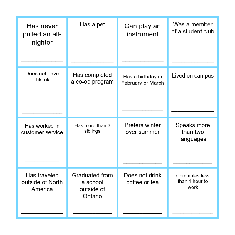 This bingo card has 16 words: Graduated from a school outside of Ontario ____________, Speaks more than two languages ____________, Can play an instrument ___________, Has never pulled an all-nighter ___________, Has worked in customer service ___________, Has a pet _____________, Prefers winter over summer ____________, Does not drink coffee or tea ____________, Does not have TikTok ______________, Has completed a co-op program _____________, Has traveled outside of North America _____________, Was a member of a student club _____________, Has more than 3 siblings _______________, Lived on campus ______________, Has a birthday in February or March ______________ and Commutes less than 1 hour to work _______________.