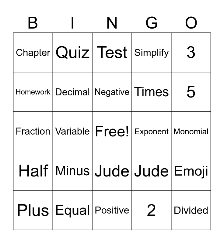 This bingo card has a free space and 24 words: Plus, Minus, Negative, 2, 3, Chapter, Quiz, Test, Exponent, Monomial, Fraction, Decimal, Jude, Emoji, Homework, Equal, Positive, Simplify, 5, Half, Variable, Jude, Times and Divided.