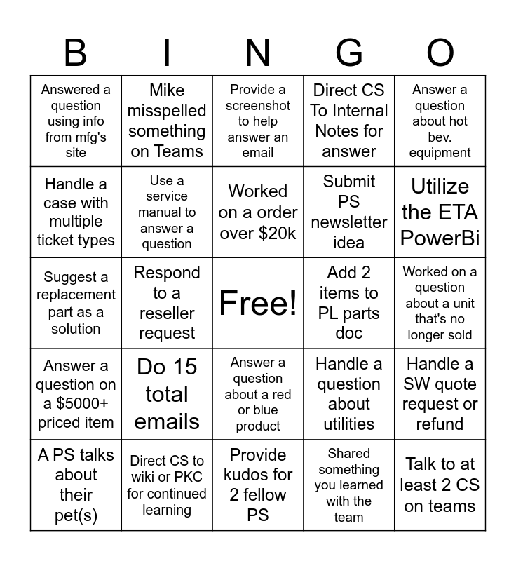 This bingo card has a free space and 24 words: Do 15 total emails, Direct CS to wiki or PKC for continued learning, Worked on a order over $20k, A PS talks about their pet(s), Answer a question about hot bev. equipment, Answered a question using info from mfg's site, Handle a case with multiple ticket types, Mike misspelled something on Teams, Add 2 items to PL parts doc, Answer a question about a red or blue product, Submit PS newsletter idea, Suggest a replacement part as a solution, Handle a question about utilities, Handle a SW quote request or refund, Use a service manual to answer a question, Shared something you learned with the team, Worked on a question about a unit that's no longer sold, Provide a screenshot to help answer an email, Utilize the ETA PowerBi, Respond to a reseller request, Talk to at least 2 CS on teams, Answer a question on a $5000+ priced item, Direct CS To Internal Notes for answer and Provide kudos for 2 fellow PS.