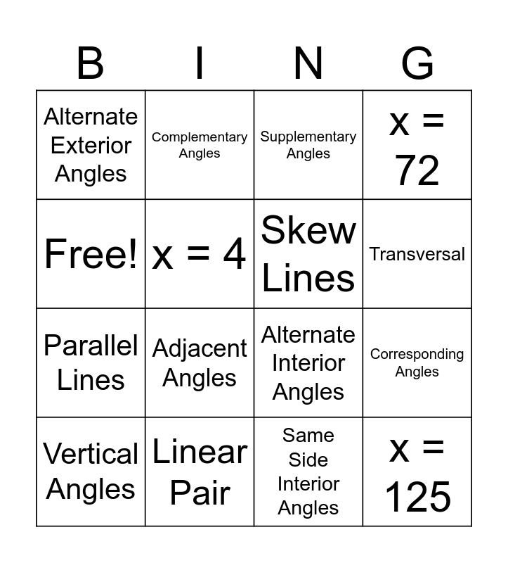 This bingo card has 16 words: Linear Pair, Corresponding Angles, Supplementary Angles, Alternate Exterior Angles, Parallel Lines, Complementary Angles, Alternate Interior Angles, Same Side Interior Angles, Free!, x = 4, Vertical Angles, x = 72, Adjacent Angles, Transversal, Skew Lines and x = 125.
