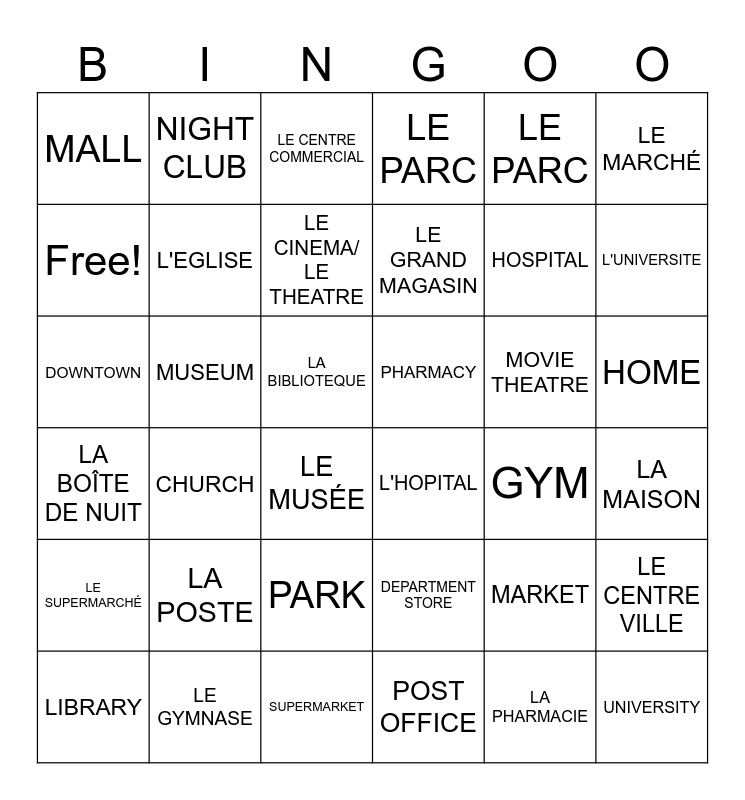 This bingo card has 36 words: LA BOÎTE DE NUIT, CHURCH, SUPERMARKET, LE GRAND MAGASIN, MOVIE THEATRE, HOME, MALL, LE GYMNASE, LE CENTRE COMMERCIAL, DEPARTMENT STORE, HOSPITAL, LE MARCHÉ, LE SUPERMARCHÉ, MUSEUM, LE CINEMA/ LE THEATRE, LE PARC, MARKET, LA MAISON, Free!, L'EGLISE, LE MUSÉE, L'HOPITAL, GYM, LE CENTRE VILLE, DOWNTOWN, NIGHT CLUB, LA BIBLIOTEQUE, POST OFFICE, LE PARC, L'UNIVERSITE, LIBRARY, LA POSTE, PARK, PHARMACY, LA PHARMACIE and UNIVERSITY.