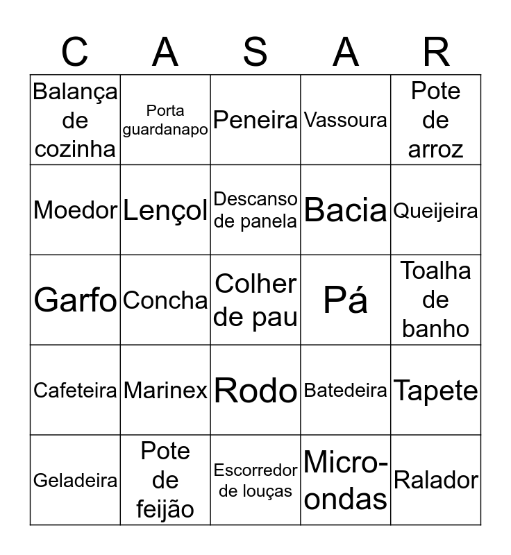This bingo card has 44 words: Panela, Colher de pau, Frigideira, Geladeira, Fogão, Micro-ondas, Peneira, Escorredor, Pote de arroz, Pote de feijão, Vassoura, Pá, Rodo, Marinex, Escorredor de macarrão, Escorredor de louças, Faca, Garfo, Parato debolo, Queijeira, Porta guardanapo, Copos, Pano de prato, Balança de cozinha, Edredon, Toalha de banho, Jogo de taças, Toalha de mesa, Batedeira, Cafeteira, Liquidificador, Tapete, Pirex, Pegador de macarrão, Concha, Espátula, Processador, Ralador, Descanso de panela, Moedor, Bacia, Potes, Lençol and Jogo de xicaras.