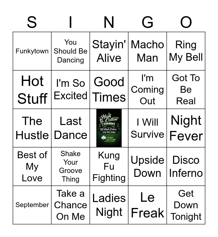 This bingo card has a free space and 24 words: Shake Your Groove Thing, Take a Chance On Me, Good Times, September, Ring My Bell, Funkytown, Hot Stuff, You Should Be Dancing, I Will Survive, Kung Fu Fighting, I'm Coming Out, The Hustle, Upside Down, Disco Inferno, I'm So Excited, Le Freak, Night Fever, Stayin' Alive, Got To Be Real, Last Dance, Get Down Tonight, Best of My Love, Macho Man and Ladies Night.