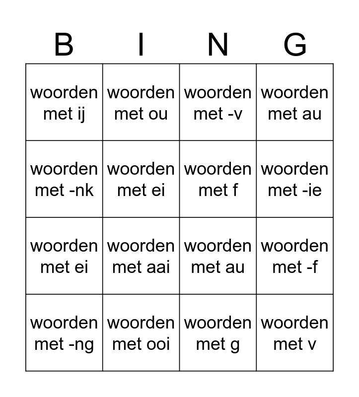 This bingo card has 20 words: woorden met -f, woorden met -s, woorden met -v, woorden met -z, woorden met -ng, woorden met -nk, woorden met ooi, woorden met ij, woorden met ei, woorden met ou, woorden met aai, woorden met au, woorden met ei, woorden met v, woorden met f, woorden met z, woorden met -ie, woorden met au, woorden met g and woorden met cht.