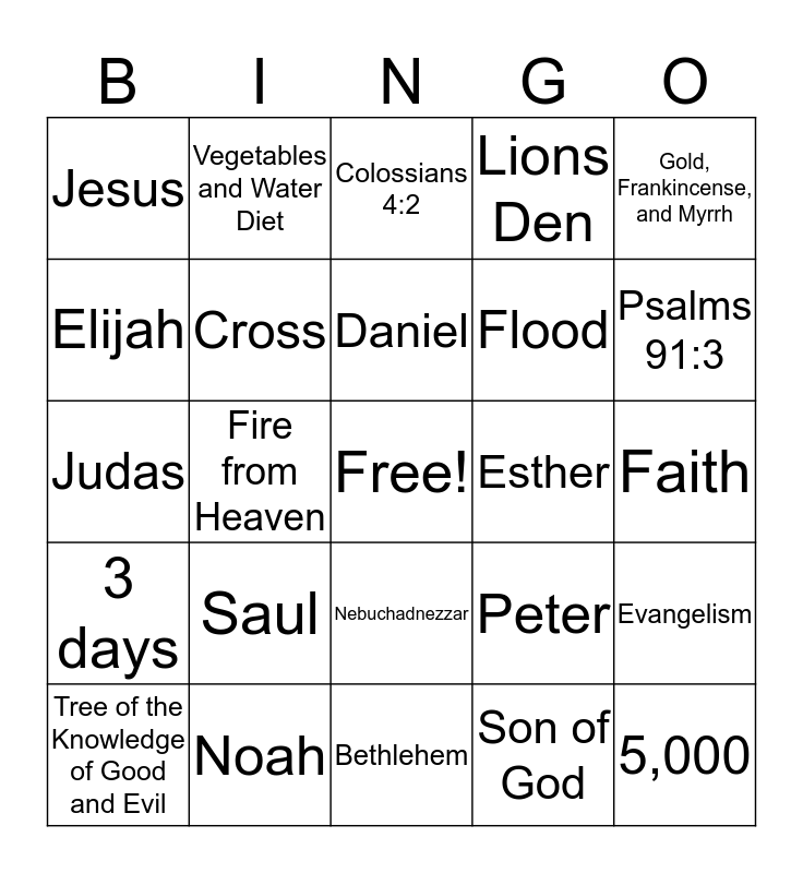 This bingo card has a free space and 24 words: Saul, Noah, Daniel, Tree of the Knowledge of Good and Evil, Gold, Frankincense, and Myrrh, Jesus, Elijah, Vegetables and Water Diet, Esther, Nebuchadnezzar, Flood, Judas, Peter, Evangelism, Cross, Son of God, Faith, Colossians 4:2, Psalms 91:3, Fire from Heaven, 5,000, 3 days, Lions Den and Bethlehem.