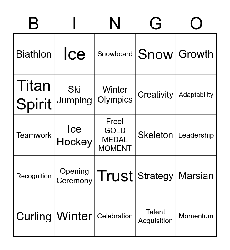 This bingo card has a free space and 29 words: Curling, Figure Skating, Ice Hockey, Speed Skating, Biathlon, Snowboard, Ski Jumping, Opening Ceremony, Skeleton, Winter, Leadership, Momentum, Celebration, Talent Acquisition, Adaptability, Communication, Trust, Recognition, Growth, Teamwork, Strategy, Collaboration, Creativity, Titan Spirit, Snow, Ice, Marsian, Winter Olympics and Double Free!!!.