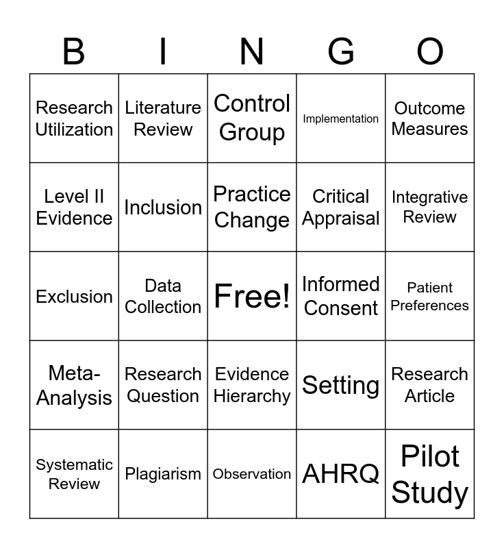 This bingo card has a free space and 64 words: PICO, Evidence Based Practice, Patient Outcomes, Research Article, Clinical Guidelines, Randomized Control Trial, Literature Review, Best Evidence, Practice Change, Quality Improvement, Evidence Hierarchy, Clinical Expertise, Patient Preferences, Outcome Measures, Level I Evidence, Level II Evidence, Data Collection, Research Utilization, Benchmarking, Critical Appraisal, Research Question, Meta-Analysis, Implementation, Dissemination, Reliability, Bias, Hypothesis, Variables, Mixed Methods, Qualitative Study, Quantitative Study, Sample Size, IRB, Research Design, Integrative Review, Systematic Review, Pain Management, AHRQ, Time Commitment, Inclusion, Exclusion, Informed Consent, Interview, Participant, Nuremberg Code, Pilot Study, Plagiarism, Hallelujah, Setting, Trustworthiness, Validity, Websites, Observation, Saturation, Anonymity, Belmont Report, Control Group, Correlation, Data Analysis, Falsification, Coding, Ethnography, Phenomenology and Generalizabilty.