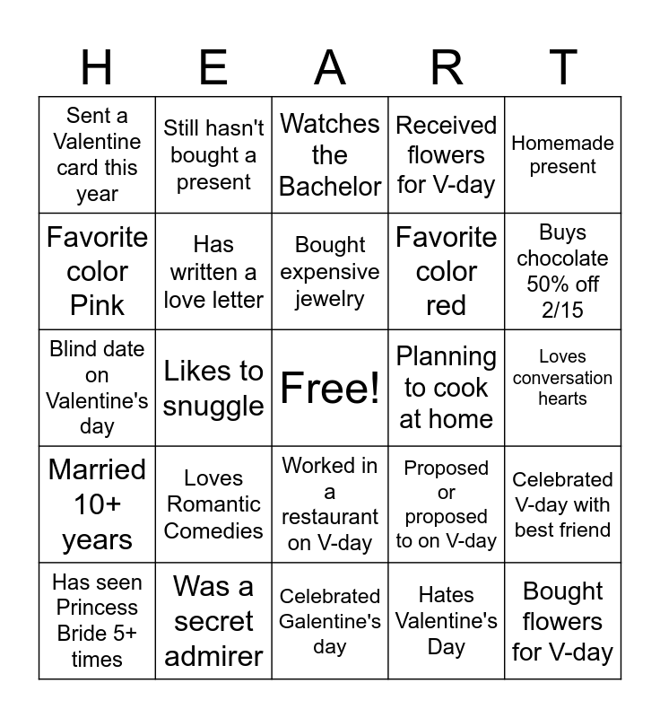 This bingo card has a free space and 34 words: Loves Valentine's Day, Hates Valentine's Day, Forgot to make reservations, February Birthday, Married 10+ years, Has written a love letter, Homemade present, Has seen Princess Bride 5+ times, Still hasn't bought a present, Had a secret admirer, Bought expensive jewelry, Watches the Bachelor, Used online dating, Has dating app on phone, Planning to cook at home, Buys chocolate 50% off 2/15, Was a secret admirer, Blind date on Valentine's day, Loves Romantic Comedies, Proposed or proposed to on V-day, Worked in a restaurant on V-day, Started new romantic relationship this year, Sent a Valentine card this year, Loves conversation hearts, Celebrated Galentine's day, Bought flowers for V-day, Received flowers for V-day, Loves Roses, Favorite color red, Favorite color Pink, Written a poem for Valentine, Likes to snuggle, Celebrated V-day with best friend and Forgot Valentine's Day.