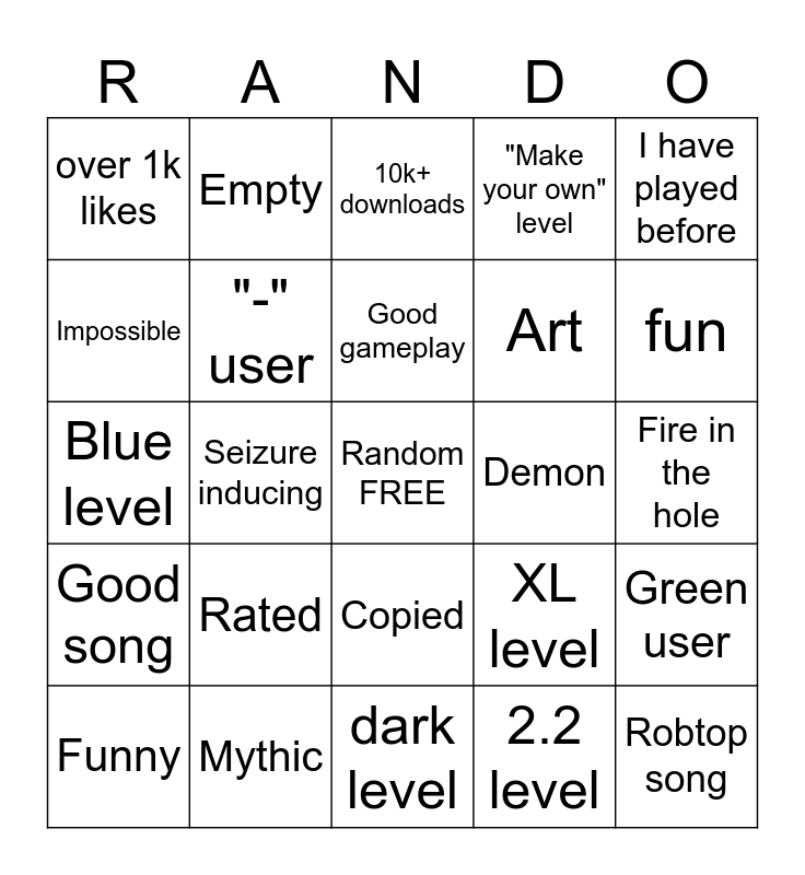 This bingo card has a free space and 24 words: Rated, Mythic, Good gameplay, Funny, I have played before, over 1k likes, Impossible, Empty, Demon, Copied, Art, Blue level, XL level, Green user, "-" user, 2.2 level, Fire in the hole, 10k+ downloads, fun, Seizure inducing, Robtop song, Good song, "Make your own" level and dark level.