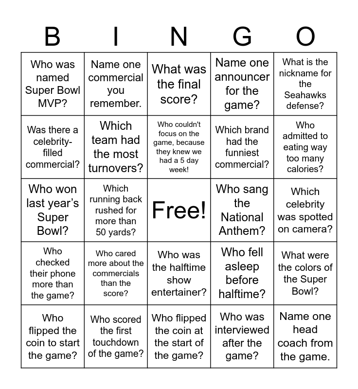 This bingo card has a free space and 30 words: Who scored the first touchdown of the game?, Which player set a record for most field goals?, Which running back rushed for more than 50 yards?, Which quarterback threw a touchdown pass?, Who was named Super Bowl MVP?, What was the final score?, Which team had the most turnovers?, Who was the halftime show entertainer?, Who sang the National Anthem?, Who flipped the coin at the start of the game?, Which celebrity was spotted on camera?, Name one head coach from the game., Who was interviewed after the game?, Who read a book during the game?, Who admitted to eating way too many calories?, Who never turned the game on at all?, Who fell asleep before halftime?, Who checked their phone more than the game?, Who cared more about the commercials than the score?, What is the nickname for the Seahawks defense?, Who won last year’s Super Bowl?, What stadium hosted the game?, Name one commercial you remember., Which brand had the funniest commercial?, Was there a celebrity-filled commercial?, Name one announcer for the game?, What were the colors of the Super Bowl?, Who flipped the coin to start the game?, Who couldn't focus on the game, because they knew we had a 5 day week! and Who has on a onesie today.