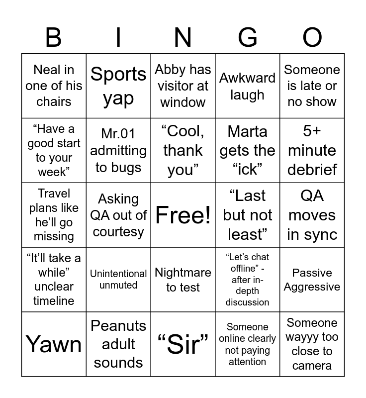 This bingo card has a free space and 26 words: Nightmare to test, Someone online clearly not paying attention, “Cool, thank you”, Peanuts adult sounds, Someone is late or no show, Neal in one of his chairs, “Have a good start to your week”, Sports yap, QA moves in sync, “Let’s chat offline” - after in-depth discussion, Marta gets the “ick”, Travel plans like he’ll go missing, Passive Aggressive, Yawn, Asking QA out of courtesy, George looks back and forth repeatedly, Awkward laugh, “It’ll take a while” unclear timeline, Abby has visitor at window, Someone wayyy too close to camera, 5+ minute debrief, “Sir”, “Last but not least”, Unintentional unmuted, Mr.01 admitting to bugs and “...that said…”.