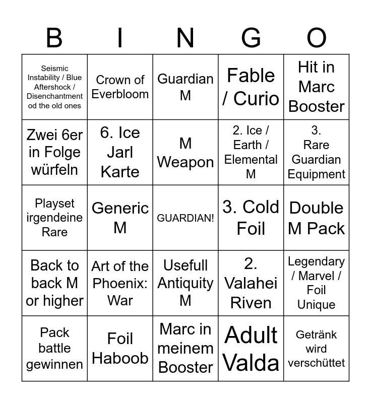 This bingo card has a free space and 24 words: Art of the Phoenix: War, Foil Haboob, M Weapon, Pack battle gewinnen, Hit in Marc Booster, Seismic Instability / Blue Aftershock / Disenchantment od the old ones, Zwei 6er in Folge würfeln, Crown of Everbloom, 3. Cold Foil, Usefull Antiquity M, 2. Ice / Earth / Elemental M, Playset irgendeine Rare, 2. Valahei Riven, Legendary / Marvel / Foil Unique, 6. Ice Jarl Karte, Adult Valda, Double M Pack, Guardian M, 3. Rare Guardian Equipment, Generic M, Getränk wird verschüttet, Back to back M or higher, Fable / Curio and Marc in meinem Booster.