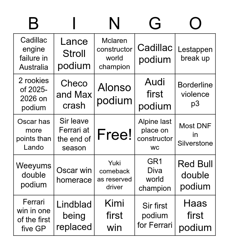 This bingo card has a free space and 24 words: Oscar win homerace, Lindblad being replaced, Alonso podium, Ferrari win in one of the first five GP, Lestappen break up, Cadillac engine failure in Australia, 2 rookies of 2025-2026 on podium, Lance Stroll podium, Alpine last place on constructor wc, Yuki comeback as reserved driver, Audi first podium, Oscar has more points than Lando, GR1 Diva world champion, Red Bull double podium, Checo and Max crash, Sir first podium for Ferrari, Most DNF in Silverstone, Mclaren constructor world champion, Borderline violence p3, Sir leave Ferrari at the end of season, Haas first podium, Weeyums double podium, Cadillac podium and Kimi first win.