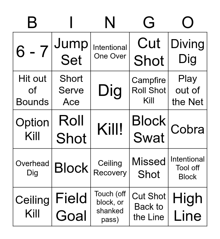 This bingo card has a free space and 39 words: Ace, Missed Serve, Tape Ace, Short Serve Ace, Ceiling Kill, Ceiling Recovery, Dig, One Arm Dig, Diving Dig, Overhead Dig, Roll Shot, Cut Shot, High Line, Cobra, Block Swat, Block, Block Cover Up, 6 - 7, Defensive Cheat, Missed Shot, Hit out of Bounds, Touch (off block, or shanked pass), Campfire Roll Shot Kill, Play out of the Net, Knuckle Dig, Knuckle Set, Hands Called, Net, Net Kill, Jump Set, Overpass, Set Over, Intentional One Over, Field Goal, Cut Shot Back to the Line, Underhand Serve, Intentional Tool off Block, Option Kill and What's the Score?.