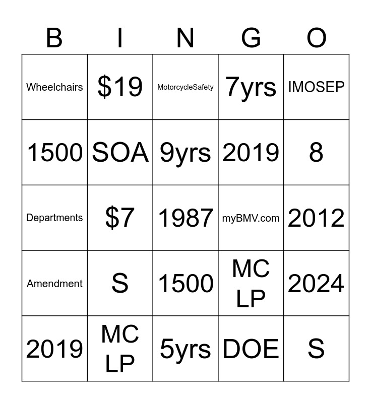 This bingo card has 50 words: 2016, 1987, Amendment, 5yrs, S, 8, $19, MotorcycleSafety, 1500, 2007, SOA, 7yrs, 2024, MC LP, 1885, MC Safety Course, 9yrs, myBMV.com, 2012, IMOSEP, $7, DOE, Wheelchairs, 2019, Departments, S, 8, $19, MotorcycleSafety, 1500, 2007, SOA, 7yrs, 2024, MC LP, 1885, MC Safety Course, 9yrs, myBMV.com, 2012, IMOSEP, $7, DOE, Wheelchairs, 2019, Departments, 2016, 1987, Amendment and 5yrs.