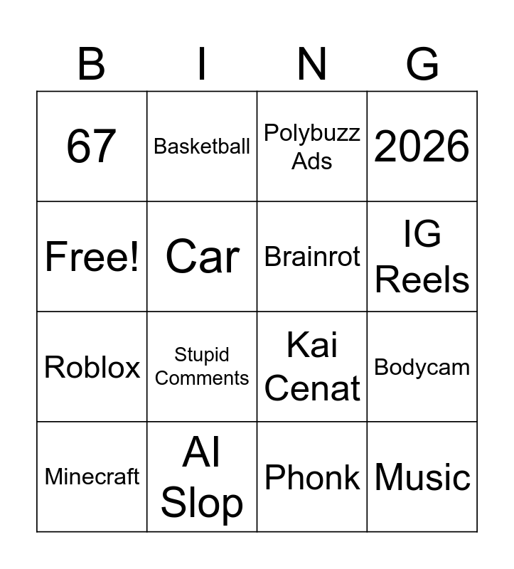 This bingo card has 16 words: AI Slop, Bodycam, Polybuzz Ads, 67, Roblox, Basketball, Kai Cenat, Phonk, Free!, Car, Minecraft, 2026, Stupid Comments, IG Reels, Brainrot and Music.