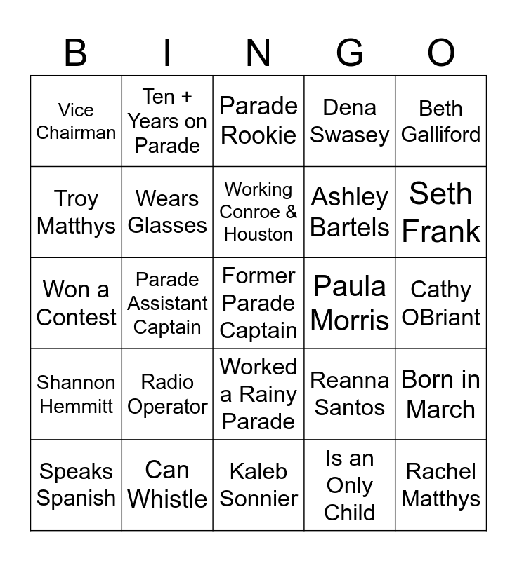 This bingo card has 39 words: Enjoys Puzzles, Loves Board Games, Houston Native, Wears Glasses, Speaks Spanish, Worked a Rainy Parade, Working Conroe & Houston, Parade Captain, Beth Galliford, Shannon Hemmitt, Parade Assistant Captain, Dena Swasey, Former Parade Captain, Cathy OBriant, Paula Morris, Radio Operator, Arginea (RJ) Holmes, Vice Chairman, Information Coordinator, Reanna Santos, Troy Matthys, Kaleb Sonnier, Ashley Bartels, Seth Frank, Parade Evaluator, Base Team, Rachel Matthys, Celeste Vershon, Five + Years on Parade, Ten + Years on Parade, Staging Team, Parade Trainer, Parade Rookie, Can Whistle, Is an Only Child, Like Broccoli, Born in March, Won a Contest and Enjoys Maths.