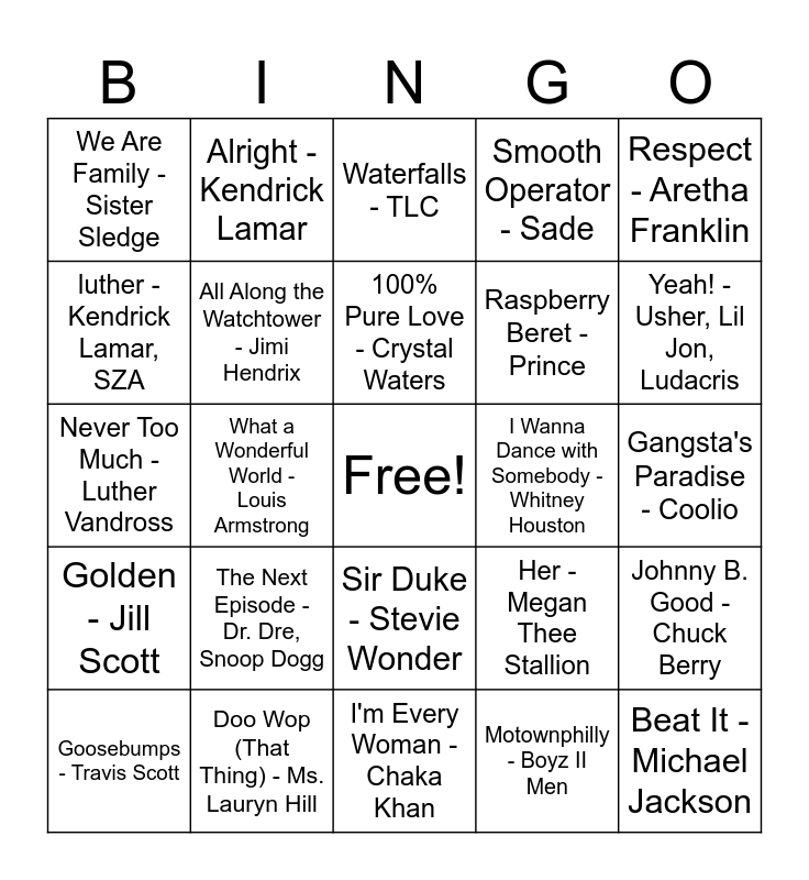 This bingo card has a free space and 41 words: Optimistic - Sounds of Blackness, Never Too Much - Luther Vandross, Rise Up - Andra Day, All Along the Watchtower - Jimi Hendrix, Doo Wop (That Thing) - Ms. Lauryn Hill, Sir Duke - Stevie Wonder, 100% Pure Love - Crystal Waters, Lovely Day - Bill Withers, Respect - Aretha Franklin, Golden - Jill Scott, What a Wonderful World - Louis Armstrong, Smooth Operator - Sade, Beat It - Michael Jackson, Gangsta's Paradise - Coolio, I Wanna Dance with Somebody - Whitney Houston, The Next Episode - Dr. Dre, Snoop Dogg, Say It Loud, I'm Black and I'm Proud - James Brown, We Are Family - Sister Sledge, Fast Car - Tracy Chapman, Waterfalls - TLC, Johnny B. Good - Chuck Berry, Girl On Fire - Alicia Keys, I'm Every Woman - Chaka Khan, Raspberry Beret - Prince, We Shall Overcome - Mahalia Jackson, Survivor - Destiny's Child, Motownphilly - Boyz II Men, Wagon Wheel - Darius Rucker, Yeah! - Usher, Lil Jon, Ludacris, Rapper's Delight - Sugar Hill Gang, Straight Outta Compton - NWA, Alright - Kendrick Lamar, Goosebumps - Travis Scott, See You Again - Tyler the Creator, Her - Megan Thee Stallion, luther - Kendrick Lamar, SZA, Crazy In Love - Beyonce, JAY-Z, Lift Every Voice and Sing - Tasha Cobbs Leonard, What's Going On - Marvin Gaye, Keep Ya Head Up - 2Pac and This is America - Childish Gambino.